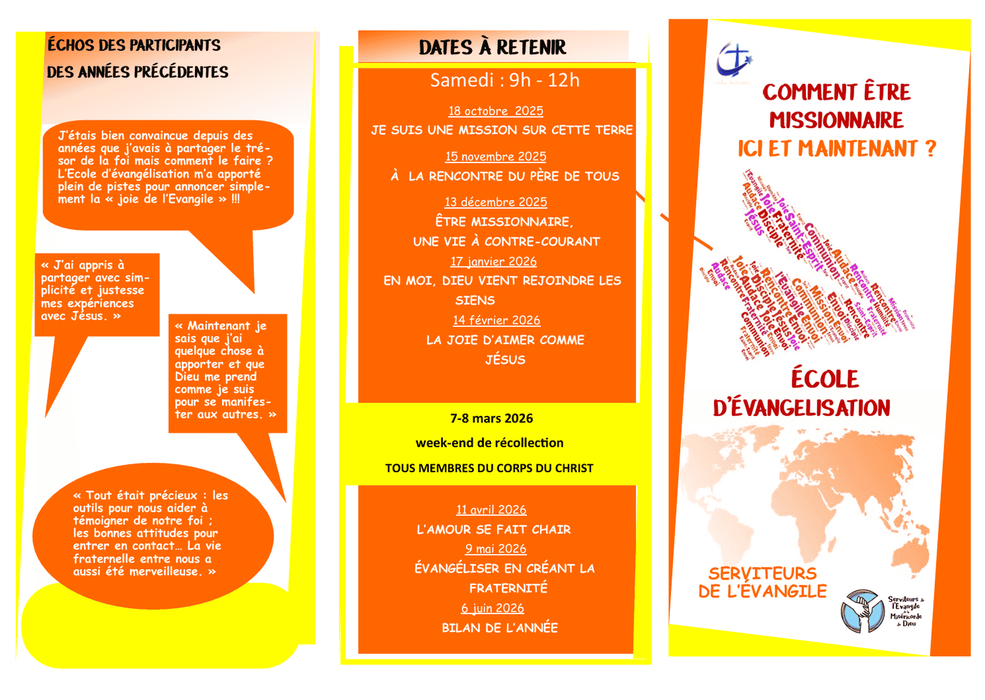 COMMENT ÊTRE MISSIONNAIRE ICI ET MAINTENANT ? L'Ecole d'Evangélisation vous propose un parcours d'octobre à juin, une matinée par mois pour se lancer ou s'affermir dans la mission. L'objectif est de grandir dans l'expérience vivante du Christ et de la fraternité, et de se former pour pouvoir transmettre cette expérience dans nos différents lieux de vie (famille, travail, voisins...).